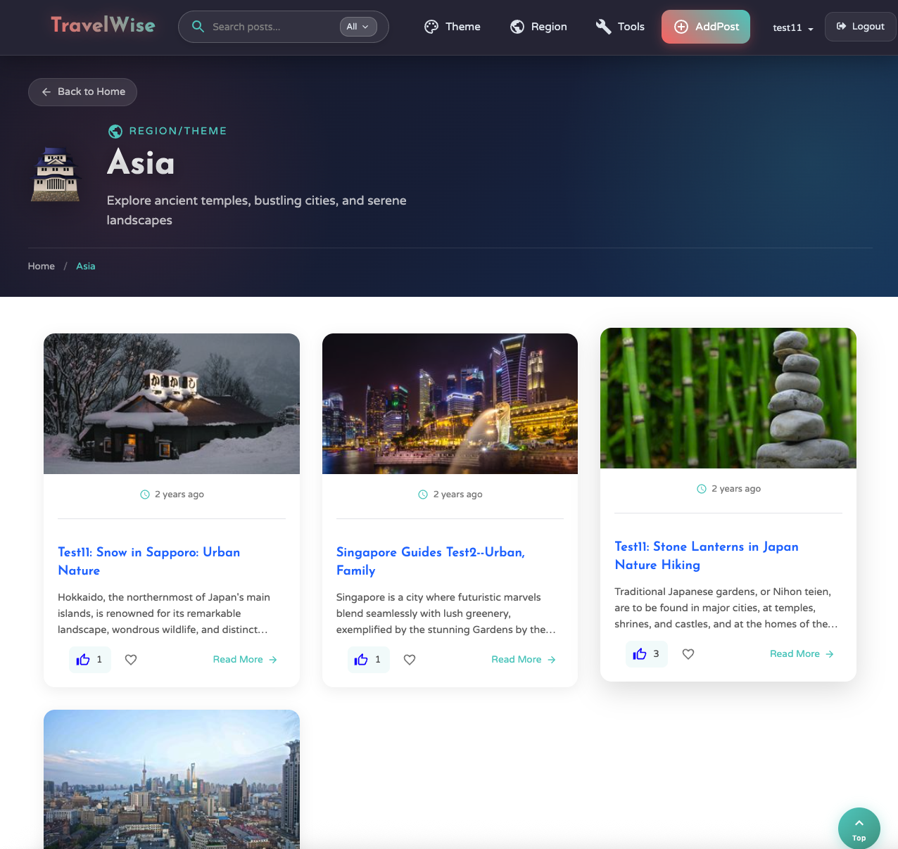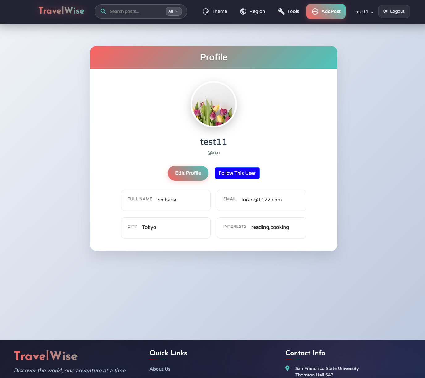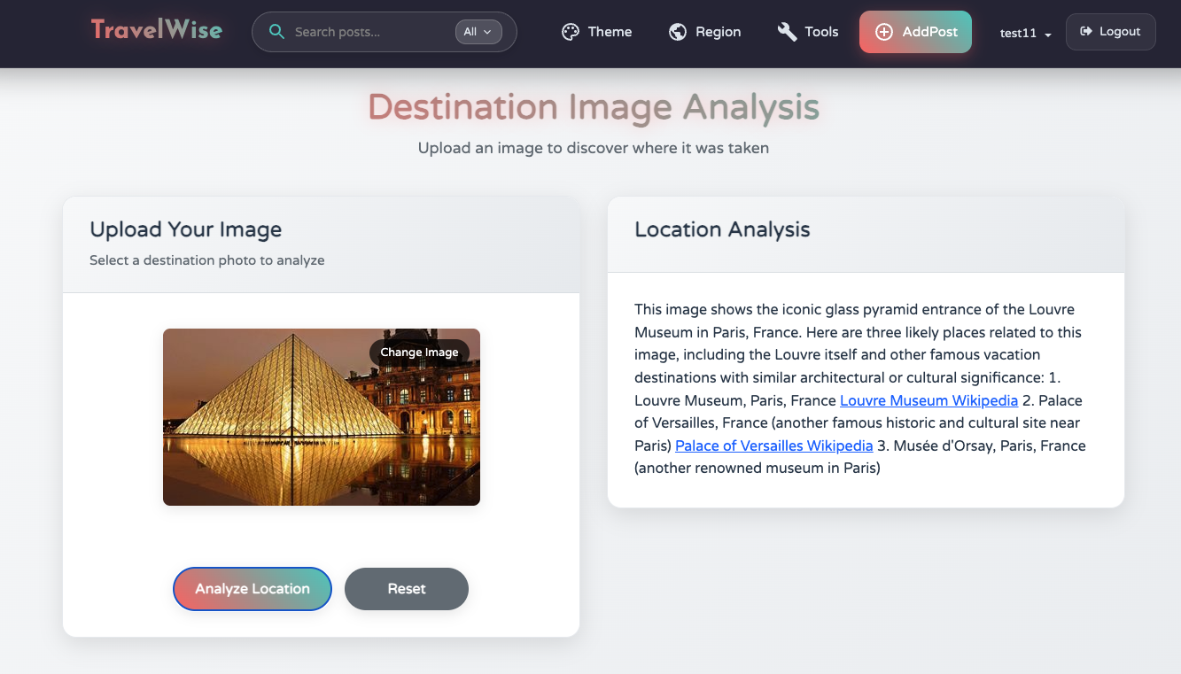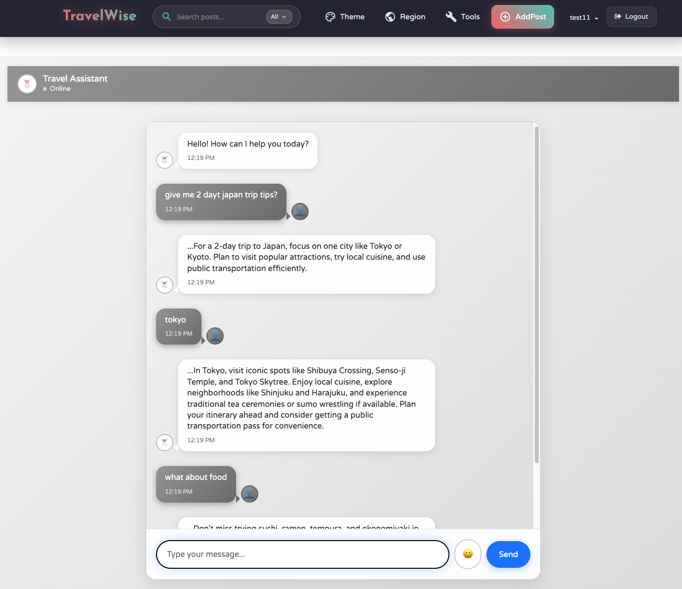 TravelWise is a comprehensive travel planning and social platform that enables users to discover destinations, share experiences, connect with fellow travelers, and access real-time travel information, including weather, local businesses, and country details. This app transforms travel blogging by integrating advanced features for modern travelers, such as an AI-powered chatbot for personalized recommendations, a destination vision feature, and real-time weather updates, all designed to enhance trip planning. It is further supported by essential project components such as the TravelWise project plan, Testing Document, architecture & REST API design & UML/UX Flows.