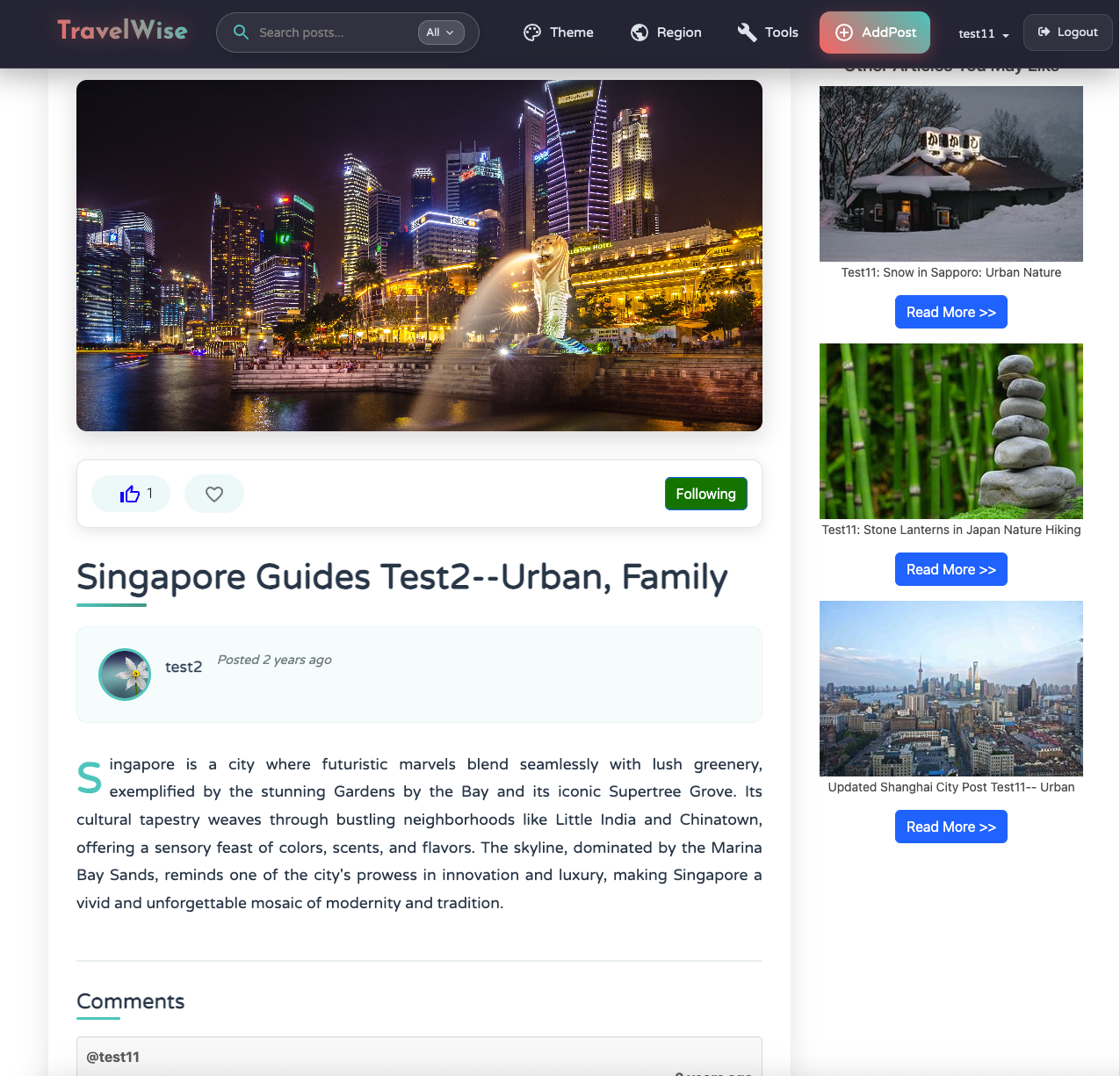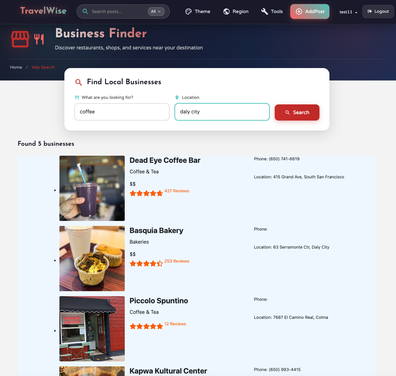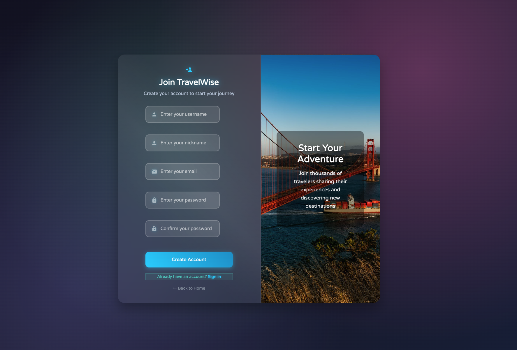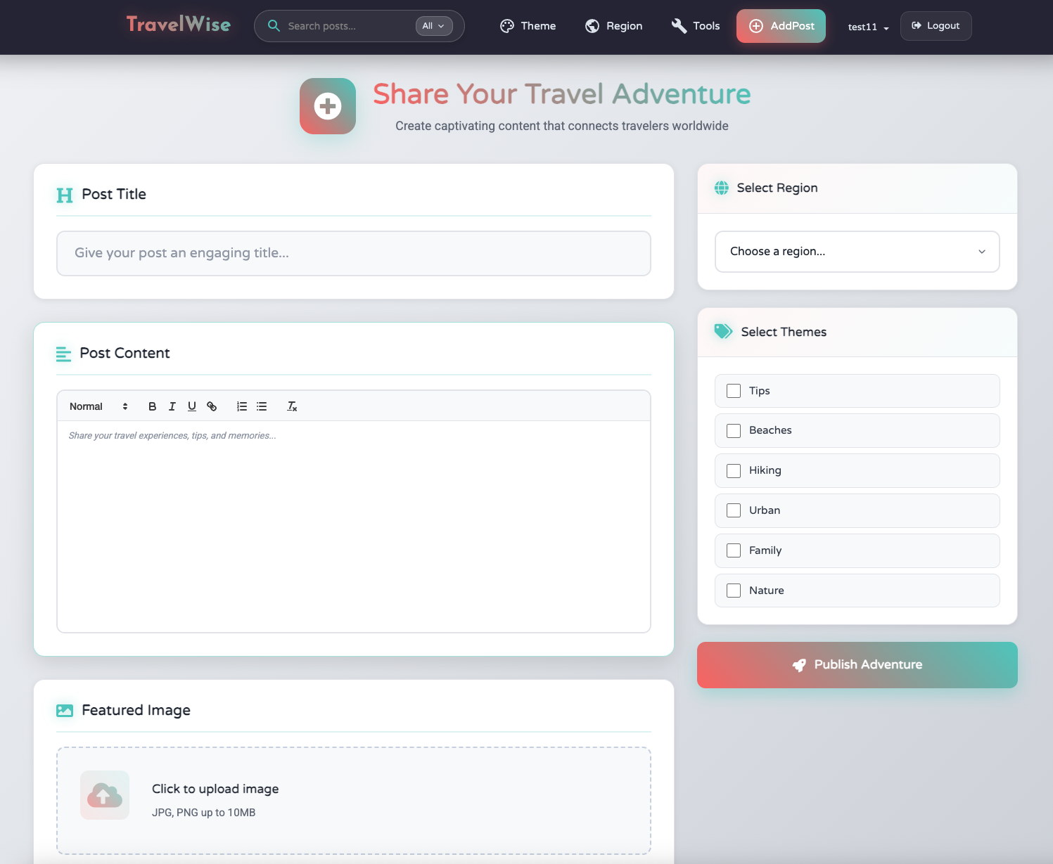 TravelWise is a comprehensive travel planning and social platform that enables users to discover destinations, share experiences, connect with fellow travelers, and access real-time travel information, including weather, local businesses, and country details. This app transforms travel blogging by integrating advanced features for modern travelers, such as an AI-powered chatbot for personalized recommendations, a destination vision feature, and real-time weather updates, all designed to enhance trip planning. It is further supported by essential project components such as the TravelWise project plan, Testing Document, architecture & REST API design & UML/UX Flows.