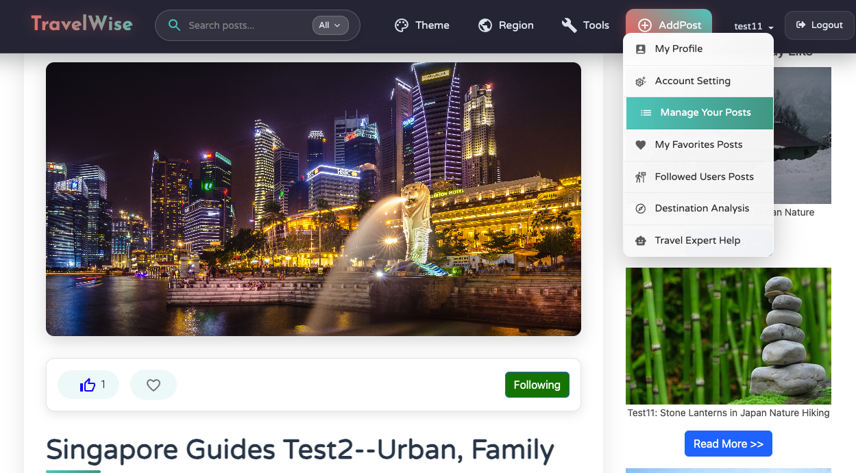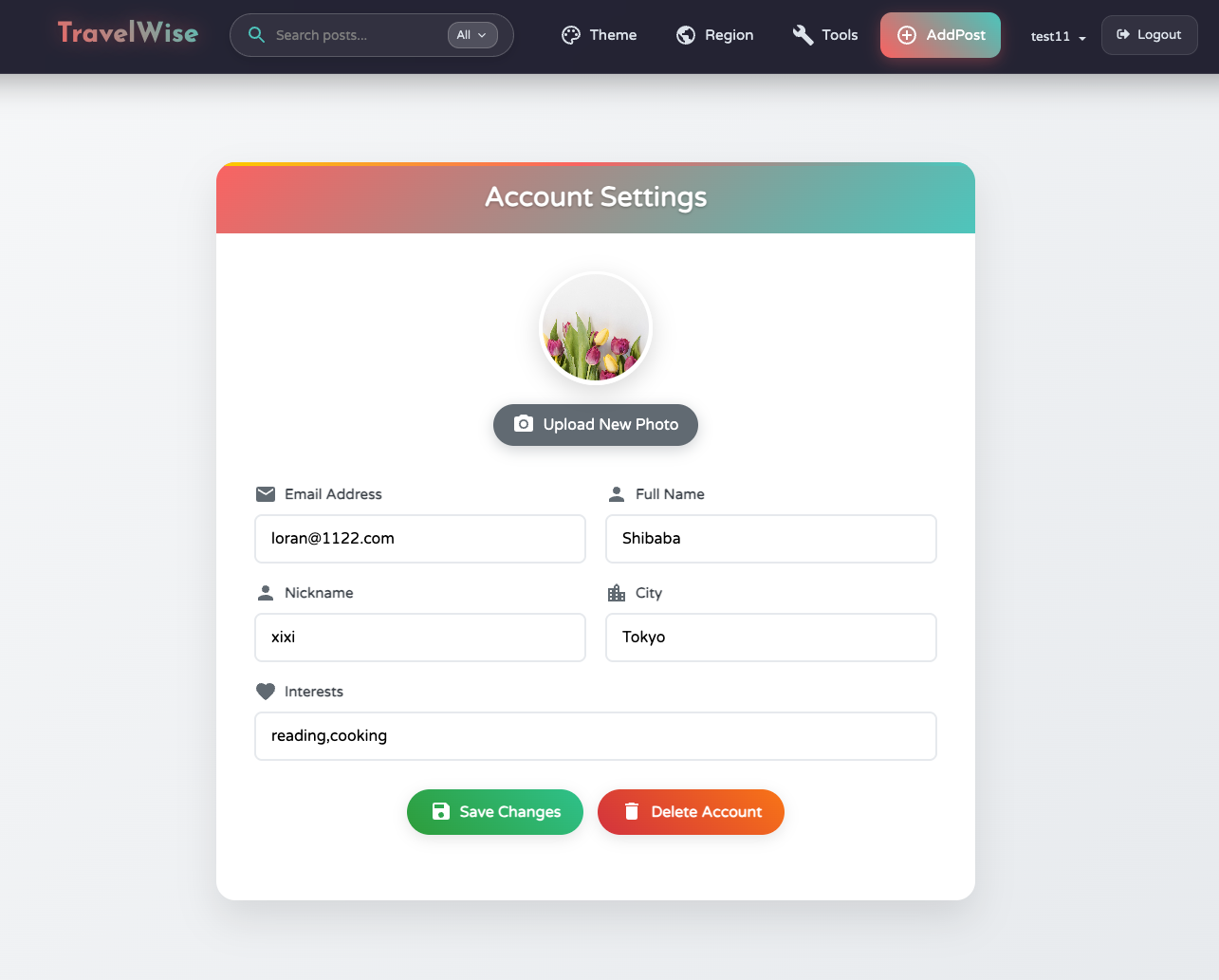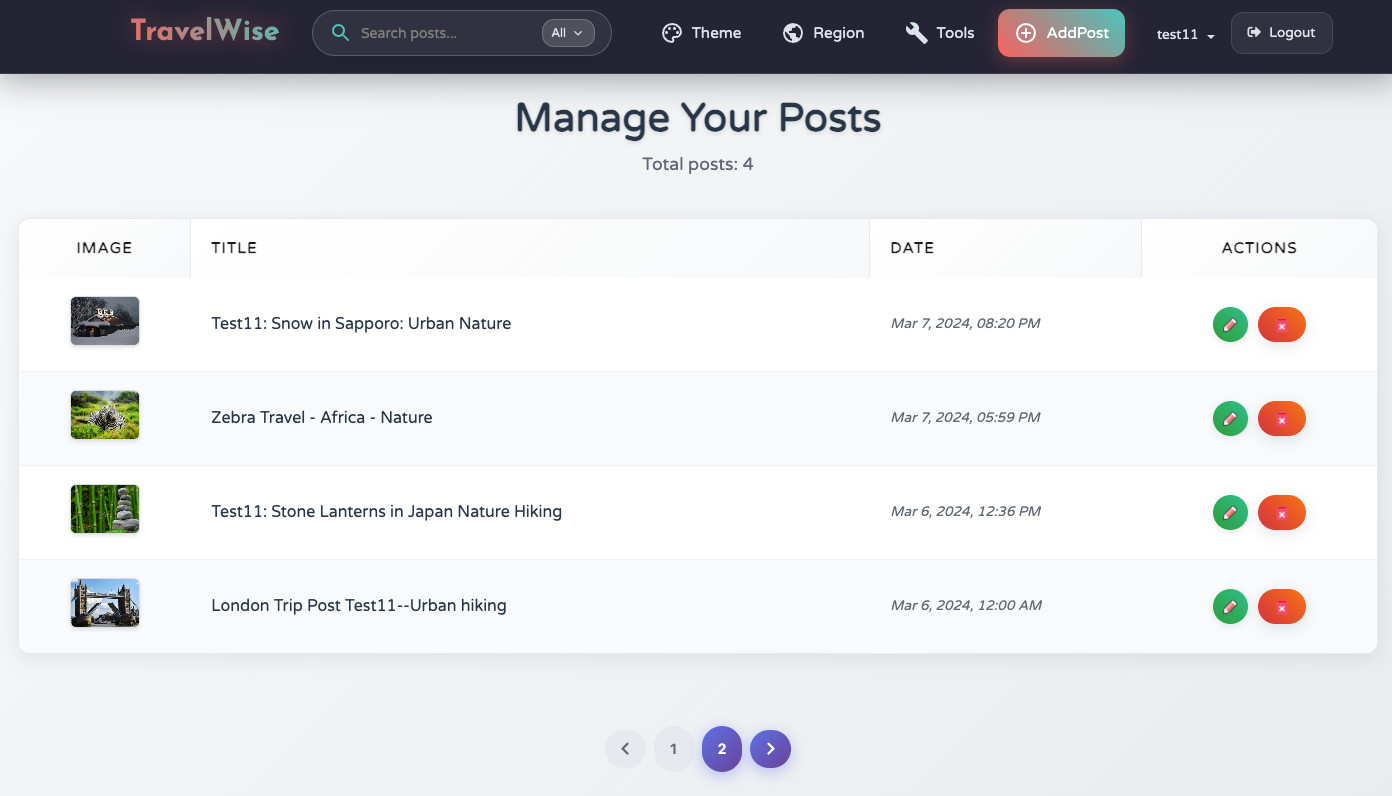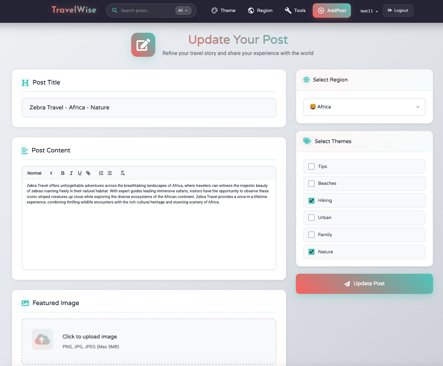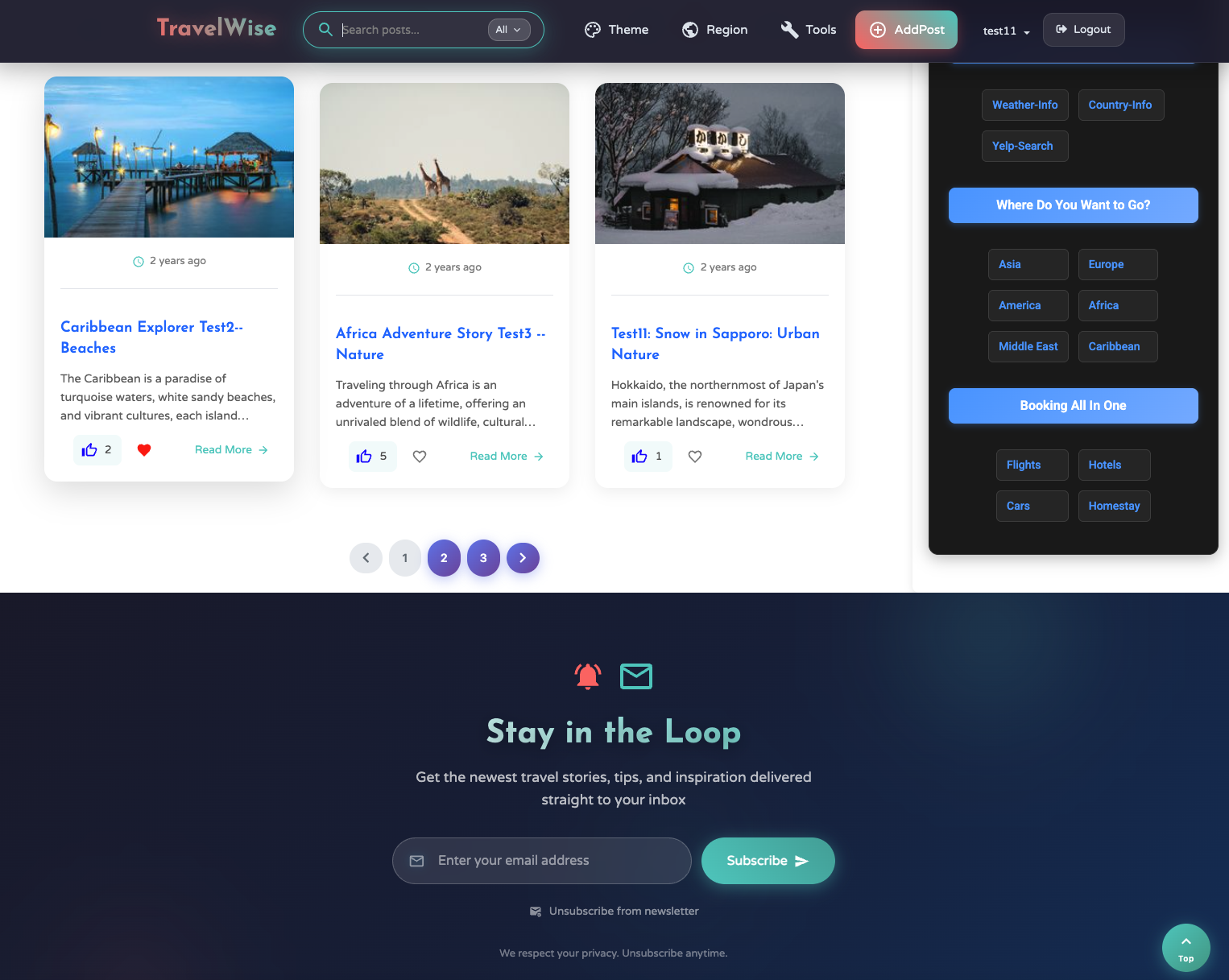 TravelWise is a comprehensive travel planning and social platform that enables users to discover destinations, share experiences, connect with fellow travelers, and access real-time travel information, including weather, local businesses, and country details. This app transforms travel blogging by integrating advanced features for modern travelers, such as an AI-powered chatbot for personalized recommendations, a destination vision feature, and real-time weather updates, all designed to enhance trip planning. It is further supported by essential project components such as the TravelWise project plan, Testing Document, architecture & REST API design & UML/UX Flows.