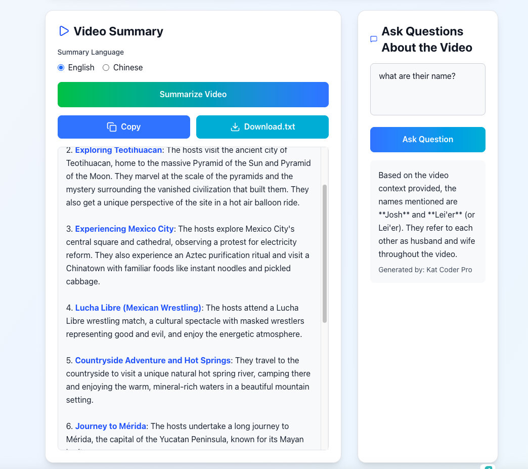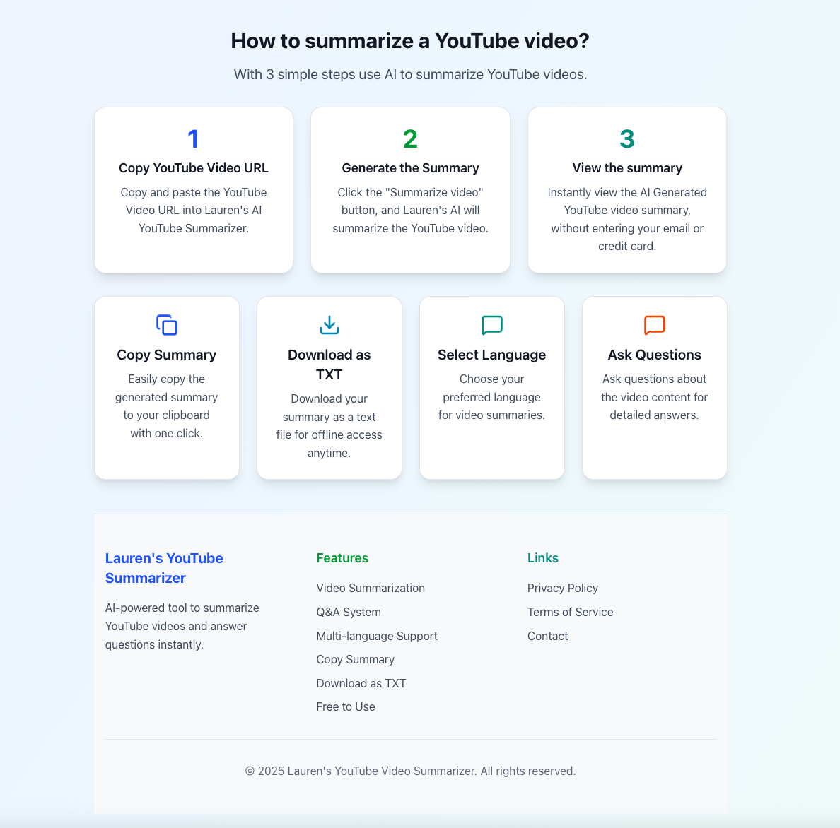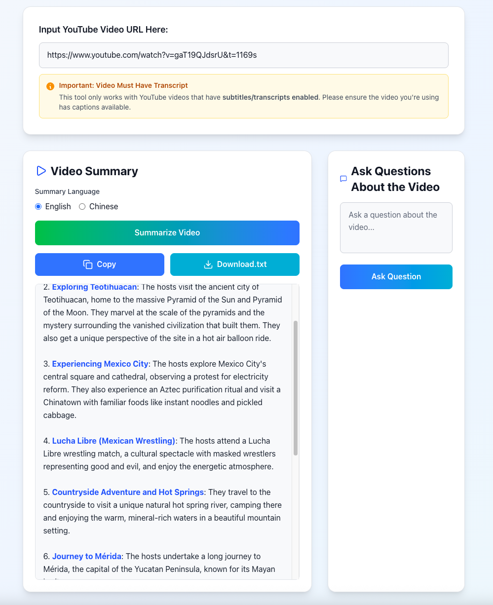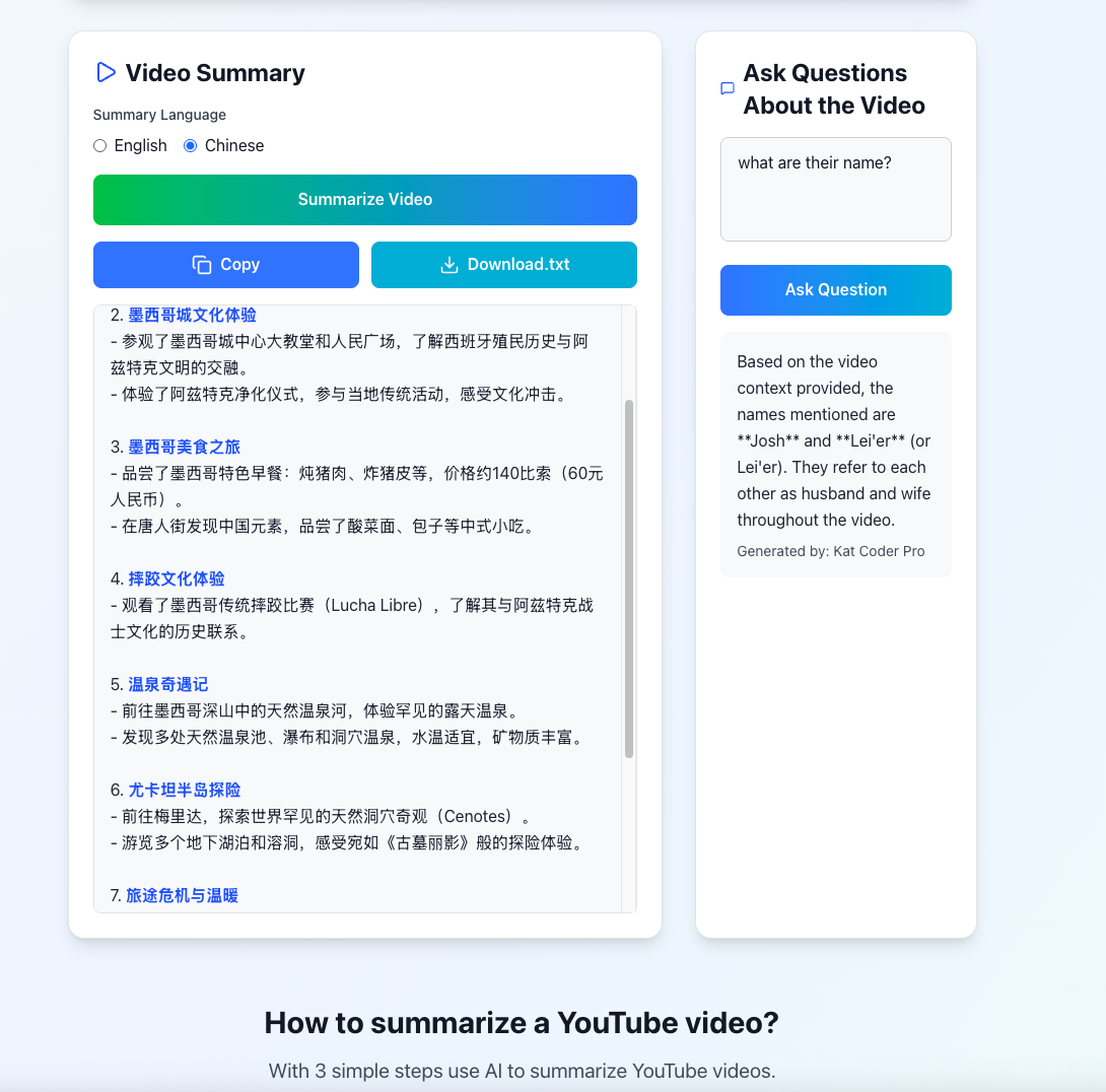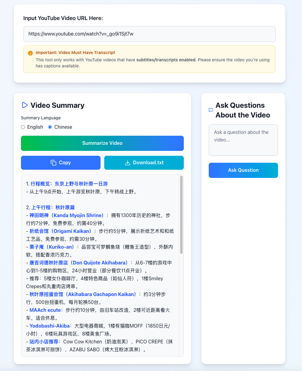 • Video Summarization: Generate concise summaries of YouTube videos in English or Chinese🌐 Language & Interface