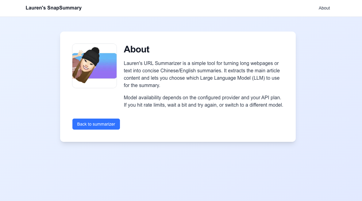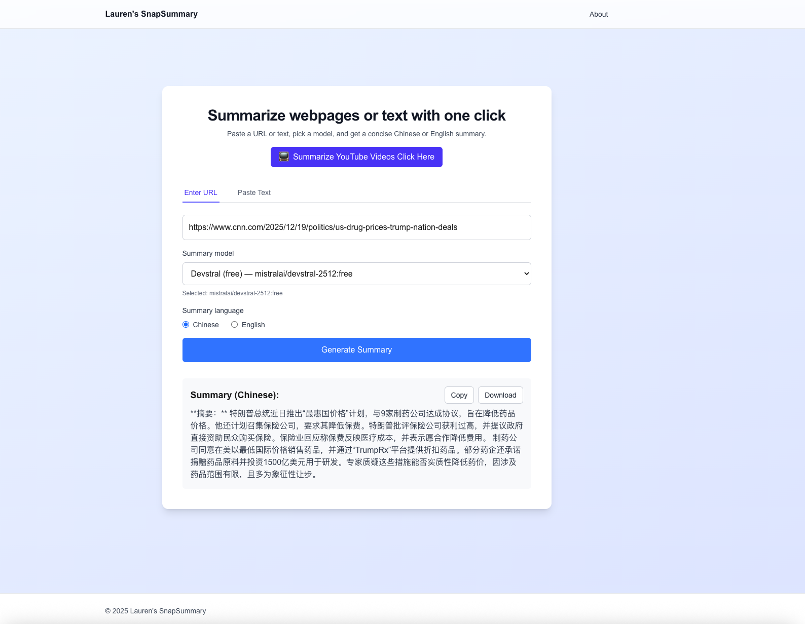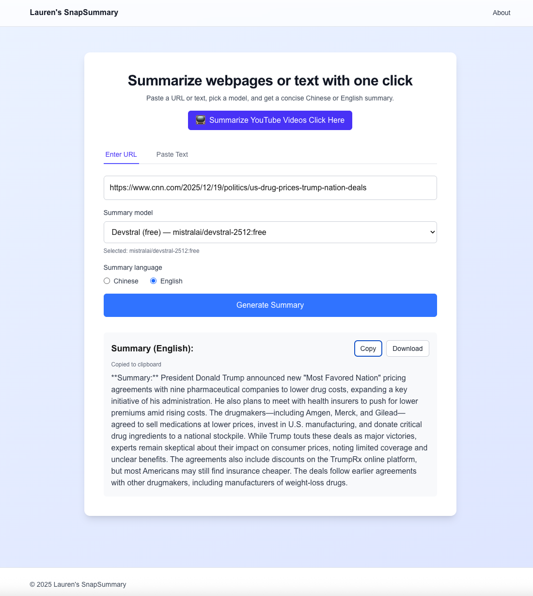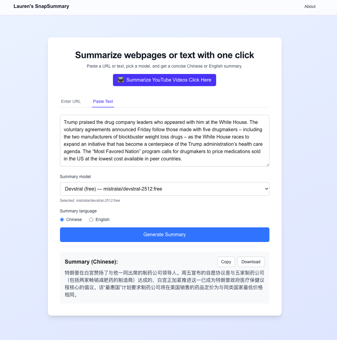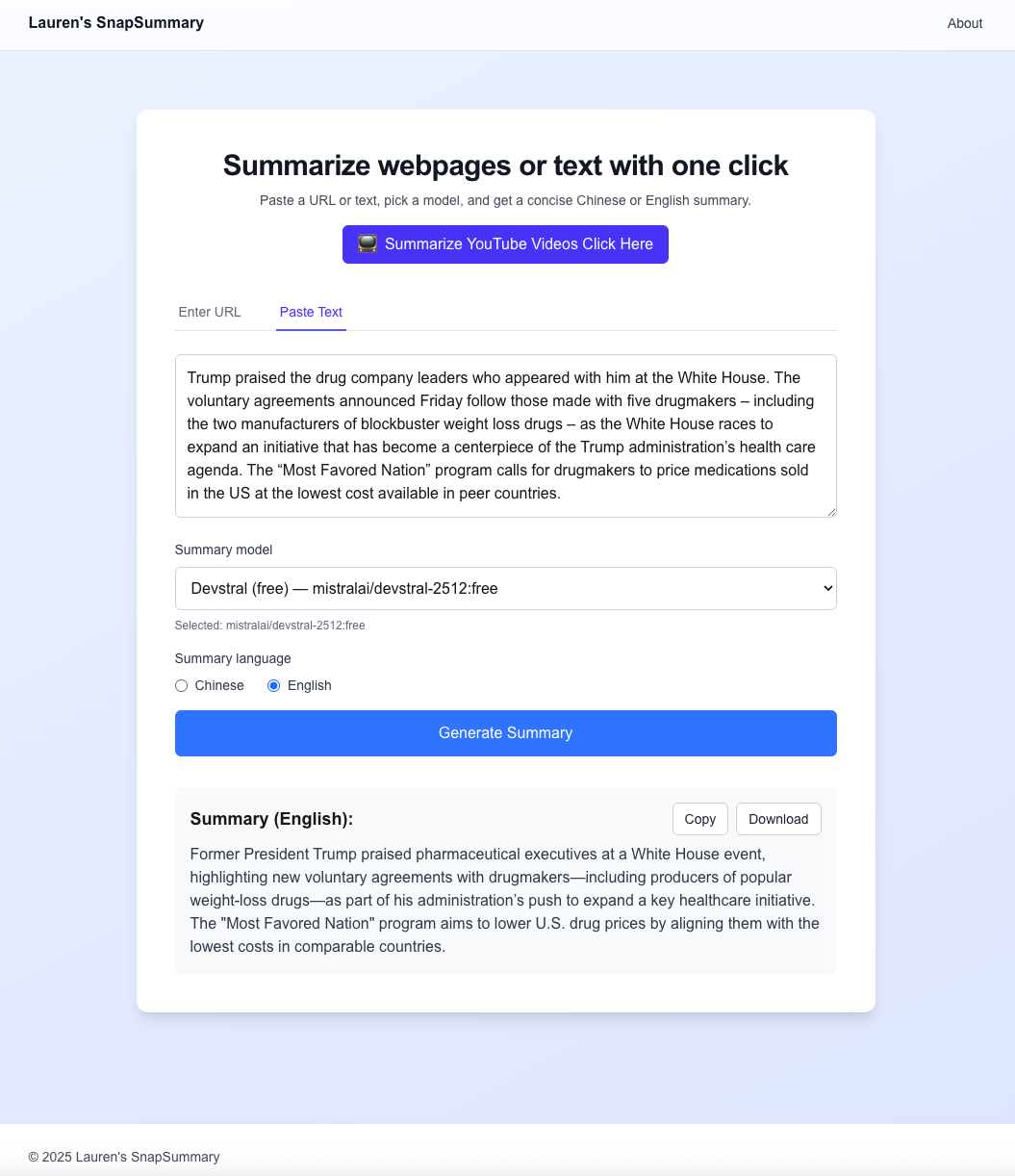 Lauren's SnapSummary is a lightweight AI summarization tool that can summarize webpages (by URL) or raw text input. It supports selecting different LLMs, generating summaries in English or Chinese, and exporting results via copy-to-clipboard or download.