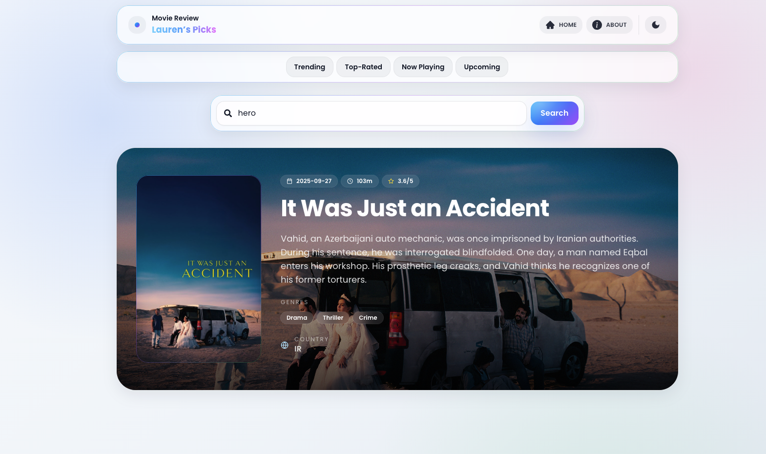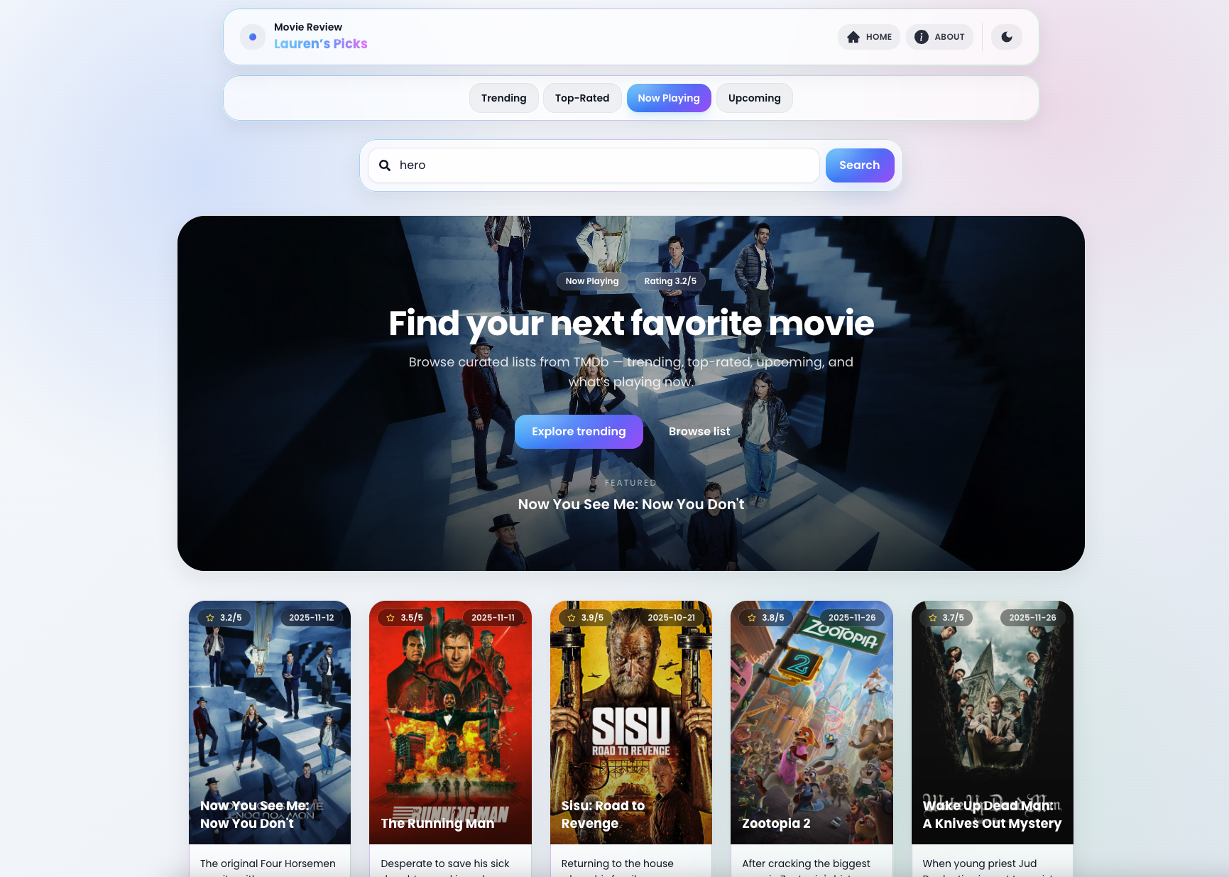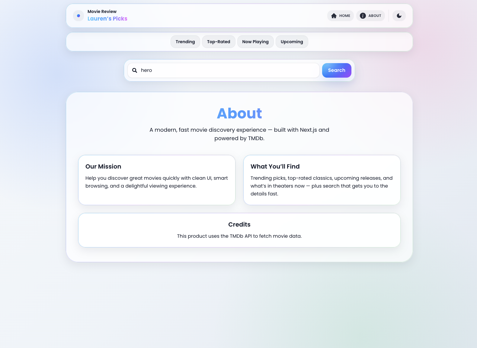 The Movie Review project is a Next.js application that uses a 3rd party IMDB API to fetch movie data and enable searching, creating a seamless interface for movie enthusiasts. It includes sections for top-rated and trending movies, offering curated recommendations.